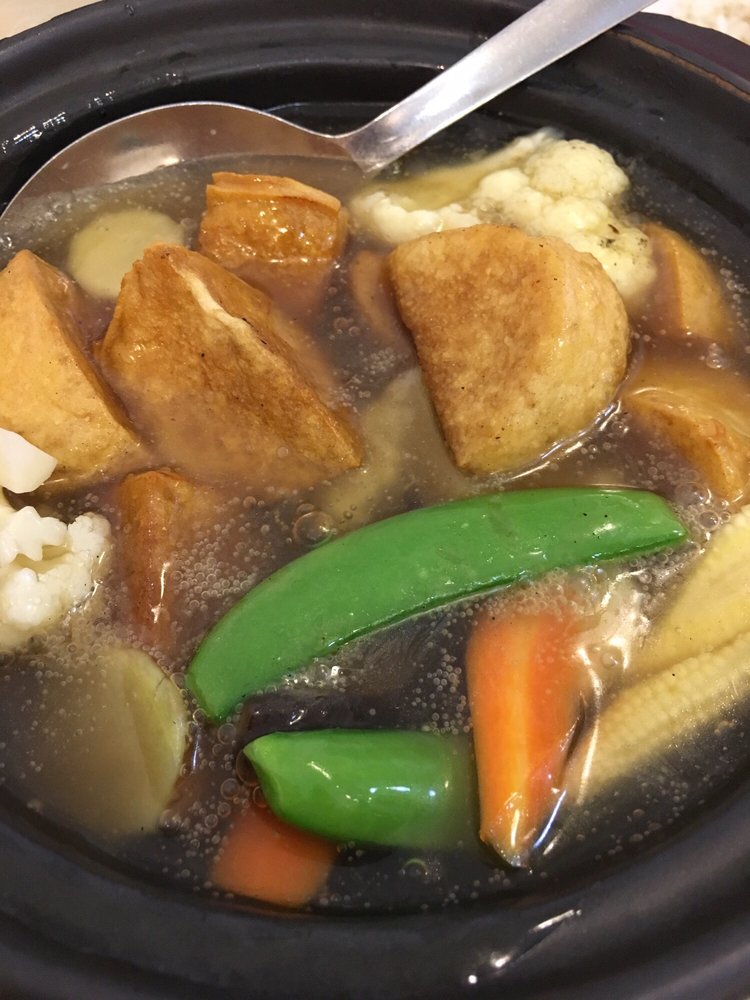 tofu cooked in a claypot with a savory sauce and various vegetables